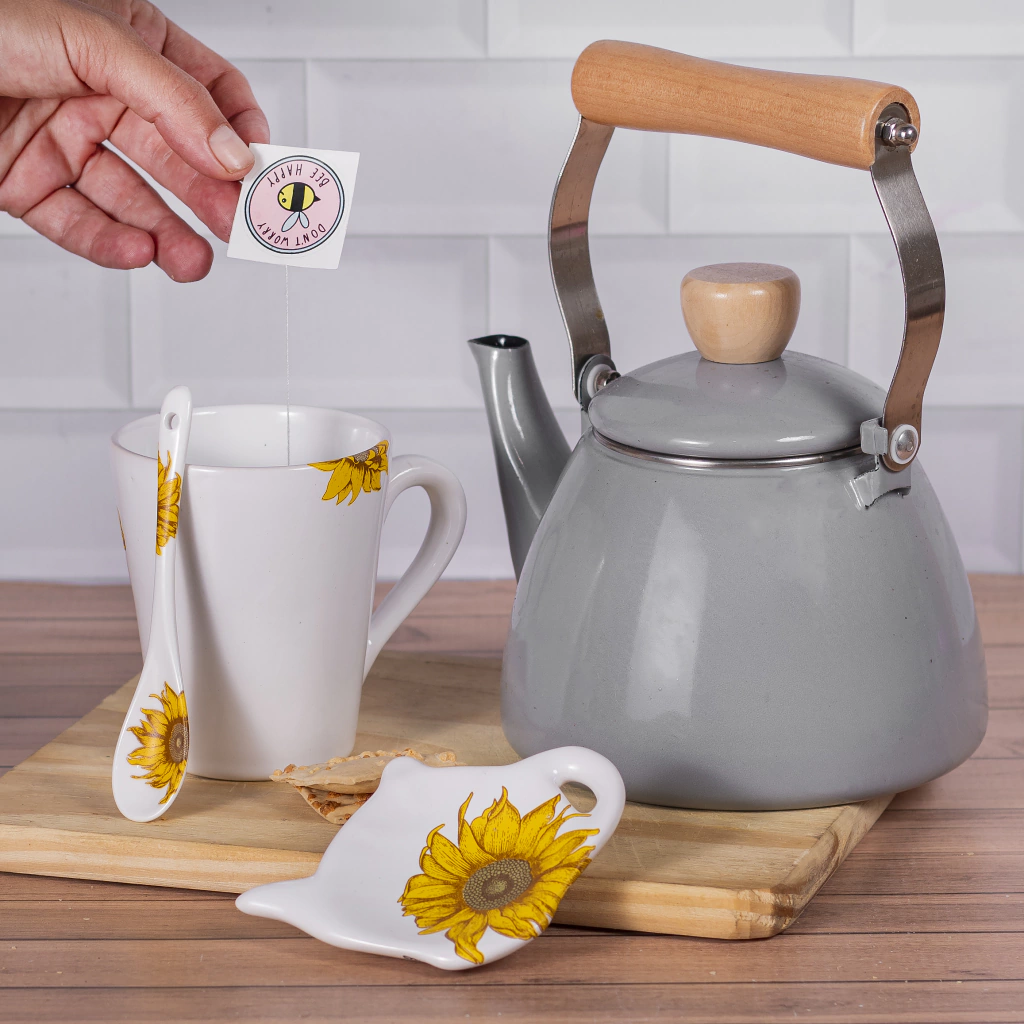 Posasaquito de té con forma de tetera, de ceramica estampada y horneada.